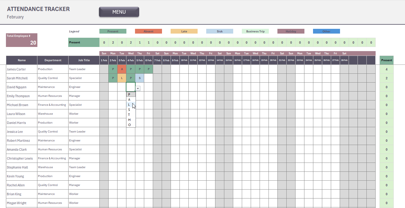 - Auto-Populated Employee List — Add your team once in the roster; names appear automatically across all monthly sheets
