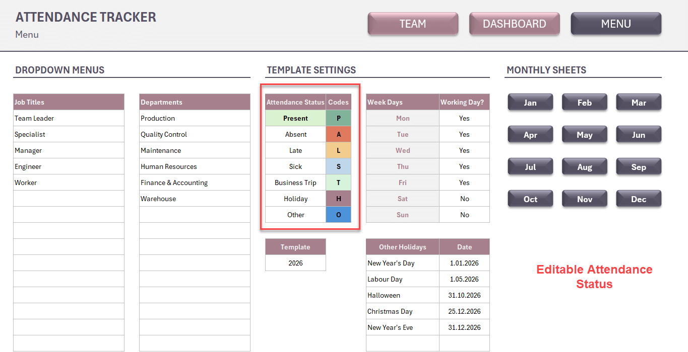 - 12 Monthly Attendance Sheets — A dedicated sheet for every month, pre-structured and ready to fill in