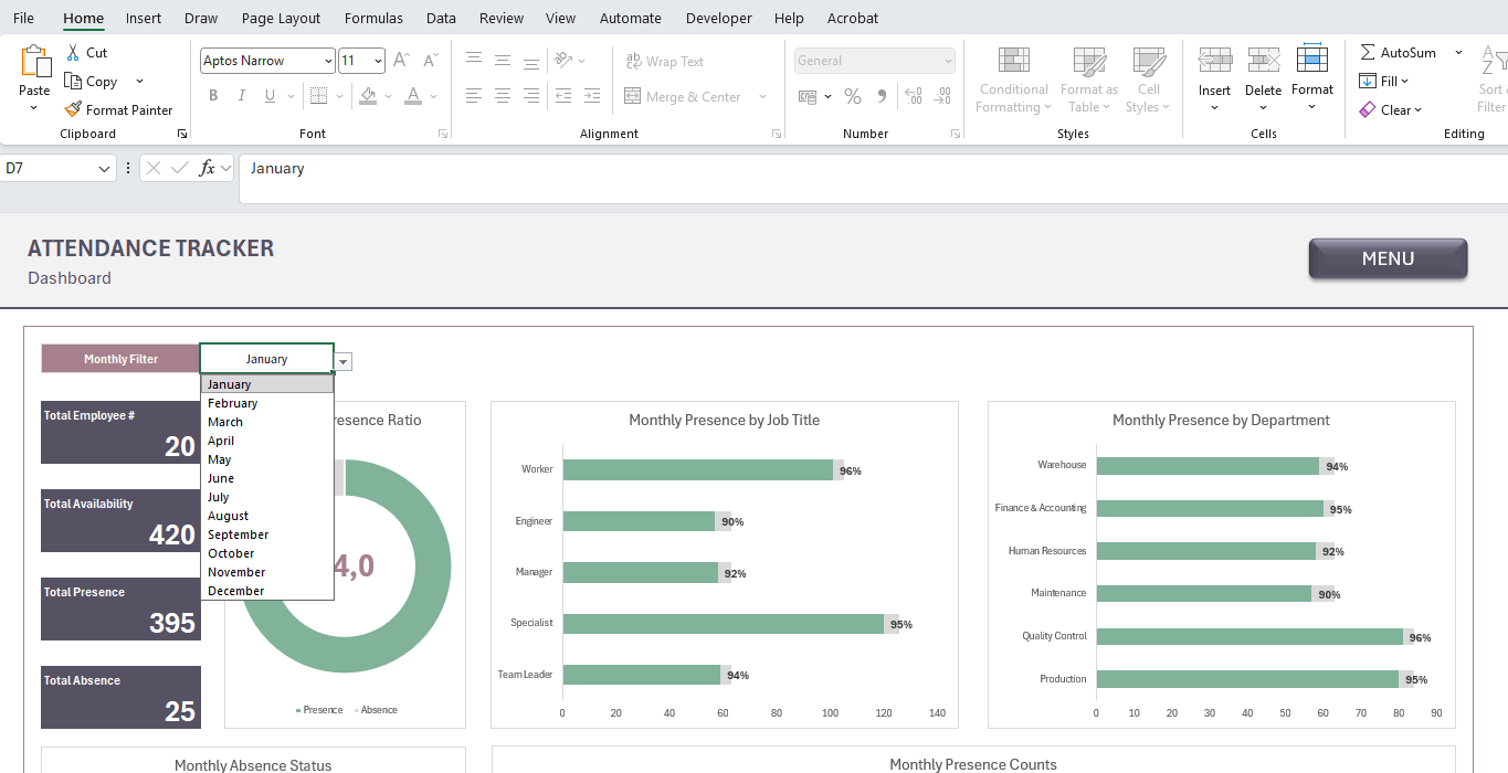 Attendance Tracker Excel Template. Spreadsheet to track attandance and absence for a team: employees, students, course attendants, etc. Dashboard included.