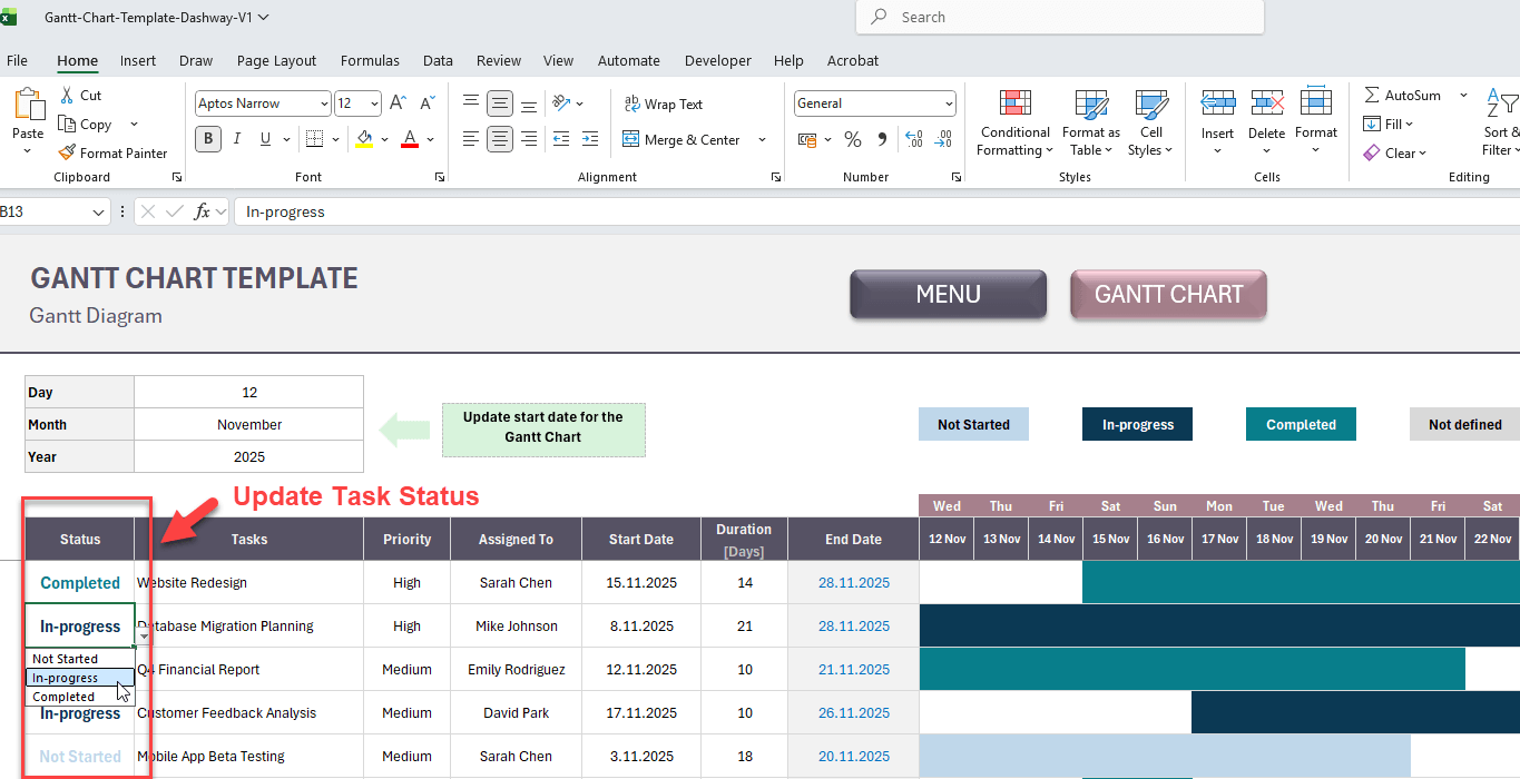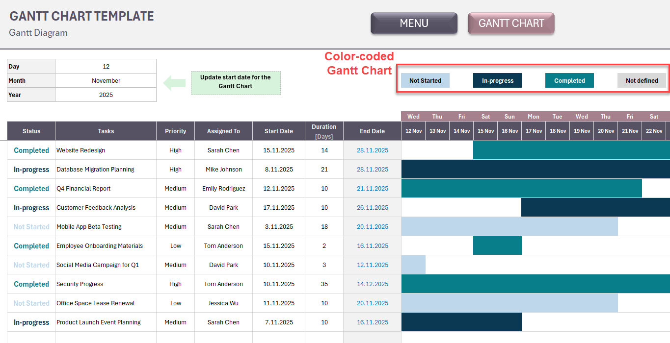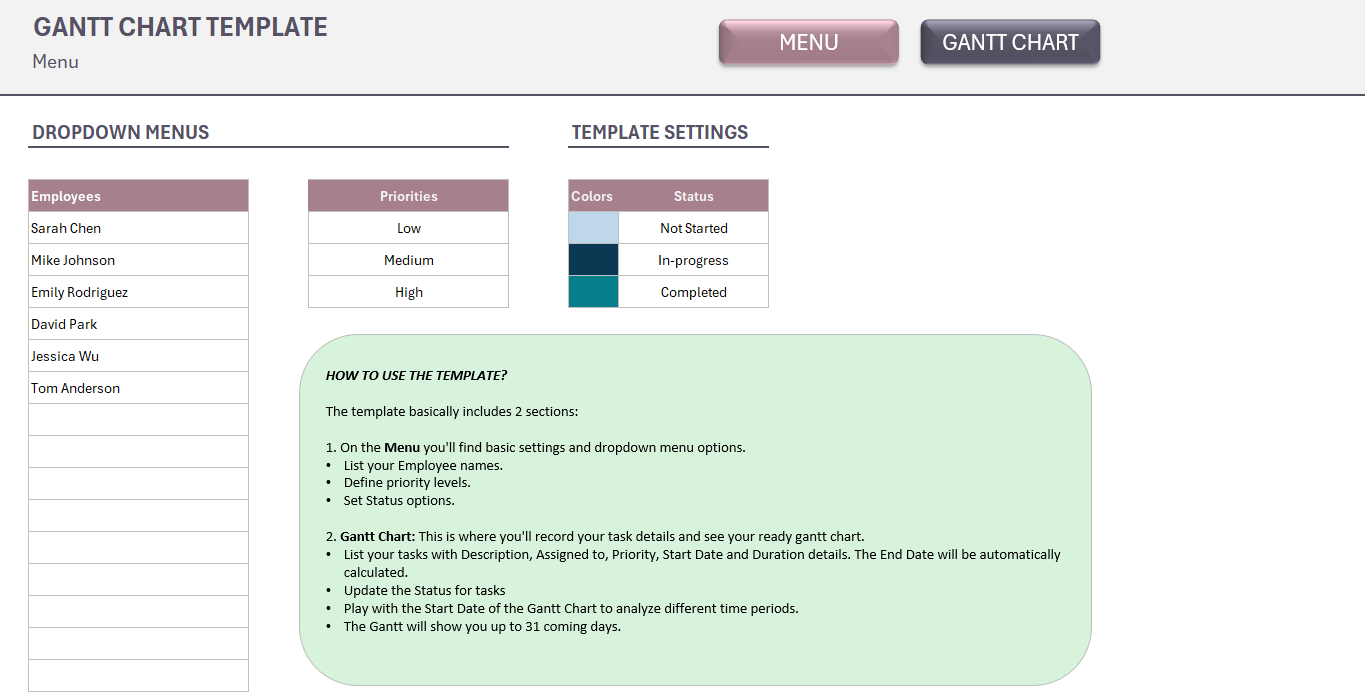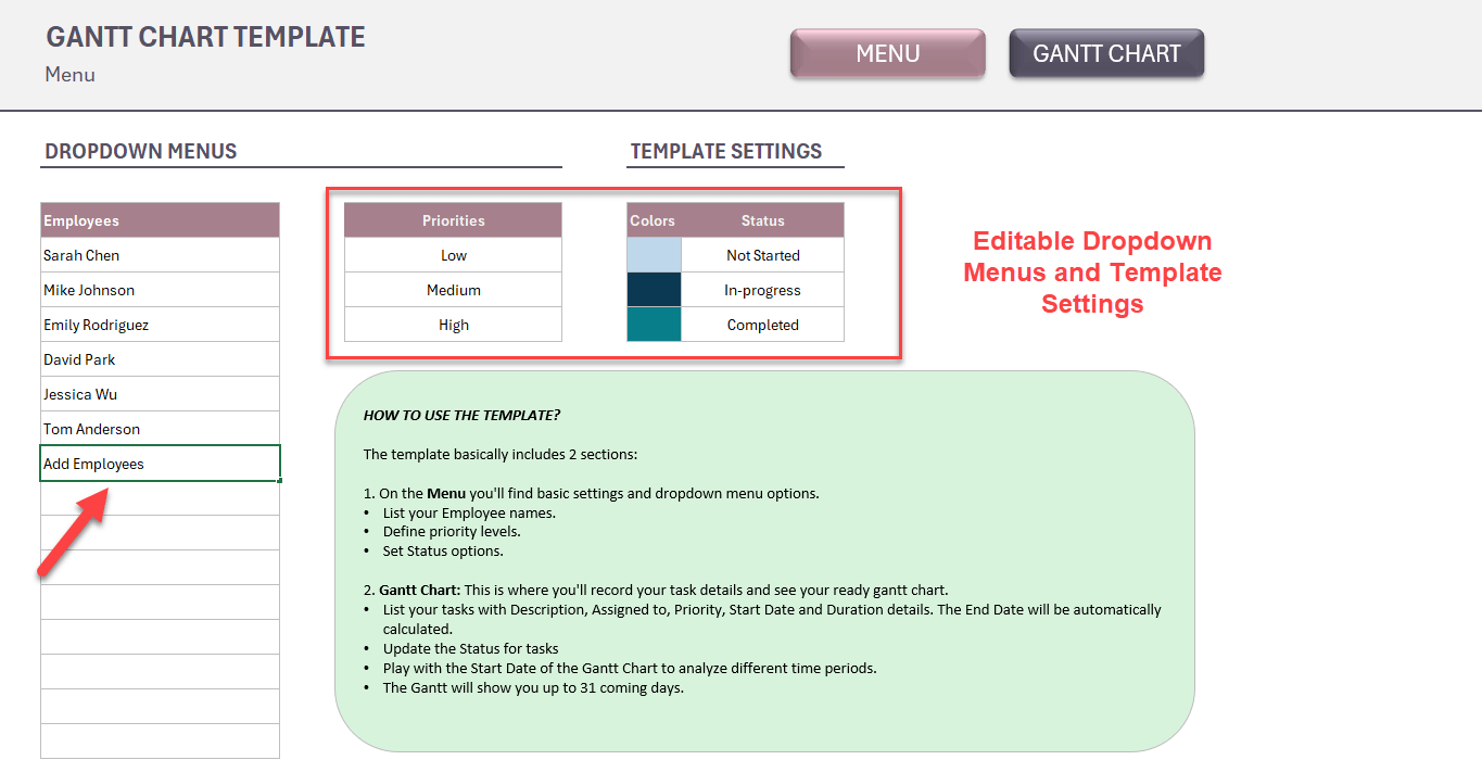 Absolutely. The Menu section lets you define your own priority levels (like High, Medium, Low) and status options (like Not Started, In Progress, Completed, On Hold) to match your workflow.