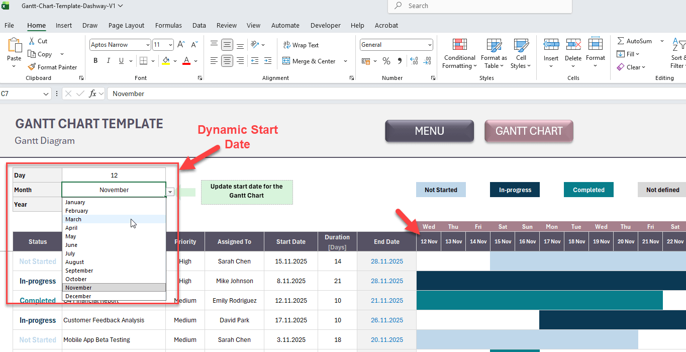 As this is a very dynamic template, we have added a Start date configuration, which will help you set the start date of your Gantt chart.