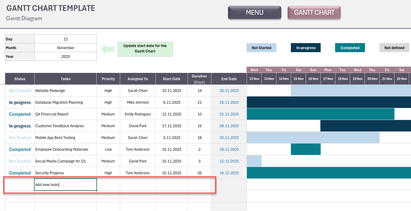 First, start adding your tasks with Task Name, Priority, Assigned To, Start Date and Duration information. The template will calculate the End Date.