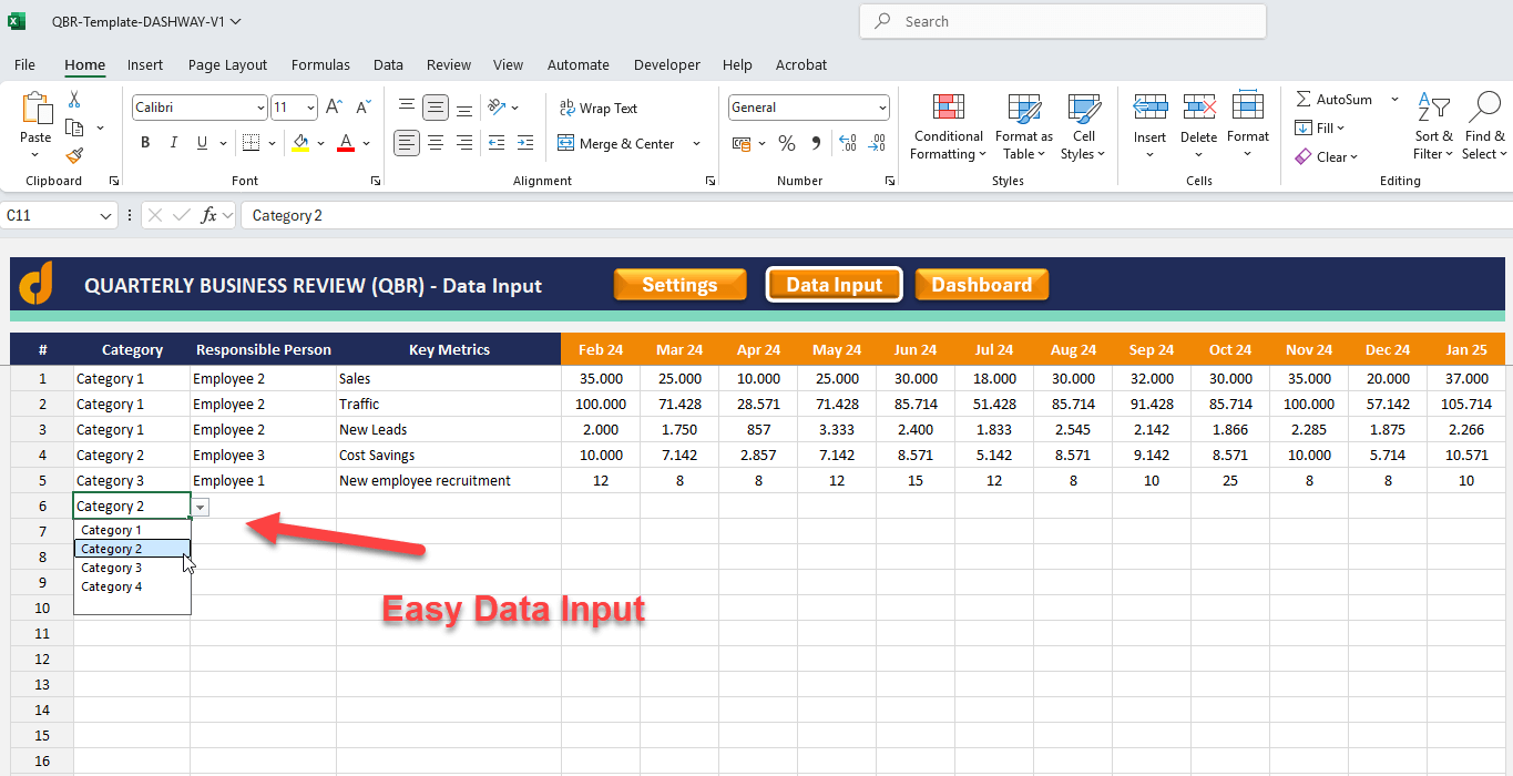 Additionally, this template has a very sleek-design data input interface. You can easily write down your key metrics with Category and Responsible Person info.